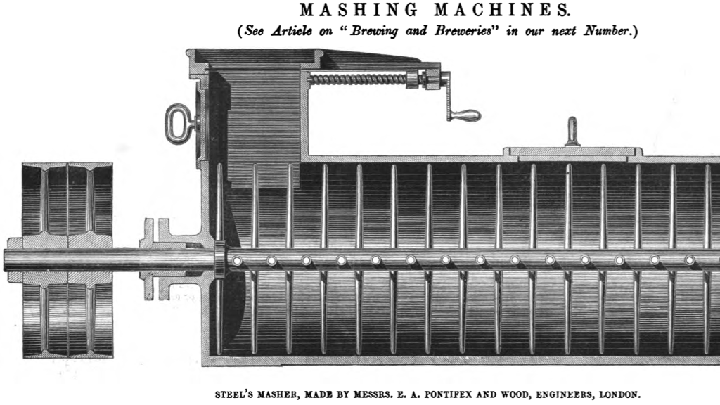 The process of using a Steel's Masher is called doughing in. When doughing in, the grist is fed into the top of the Steel's Masher and then into a horizontal feed auger at a right hand turn. While the grist is in the feed auger, it is typically mixed with mash water and then passed through a series of paddles or rods to mix the water and the grist thoroughly. The mixture is then fed into the mash tun.